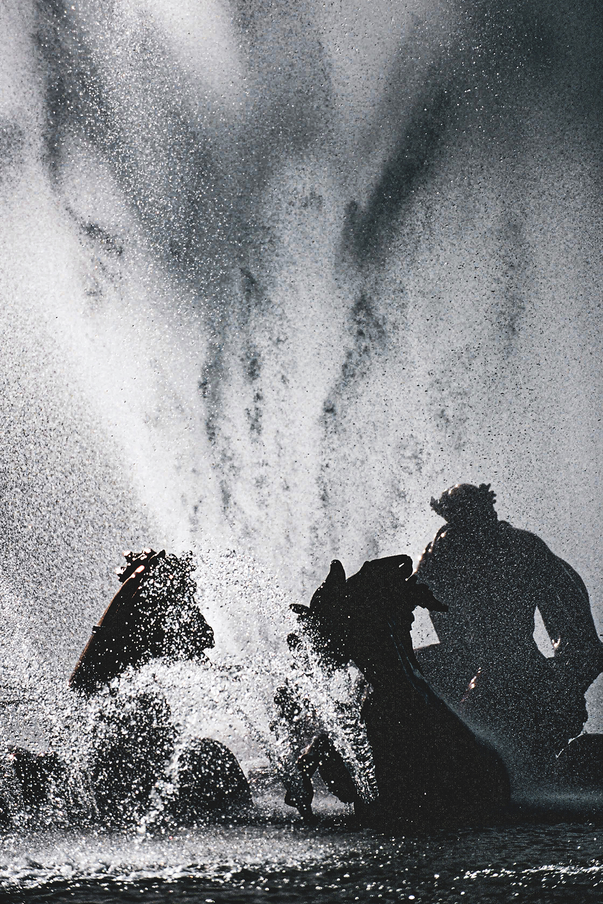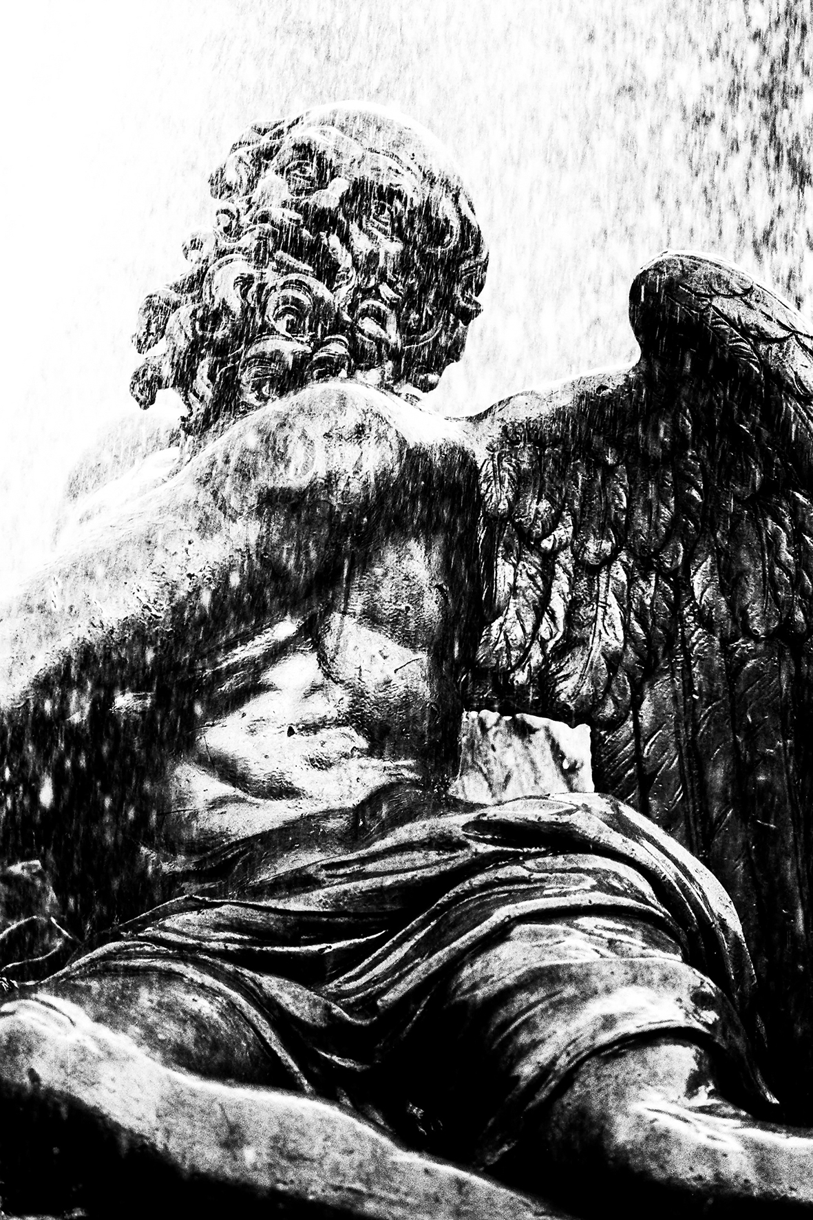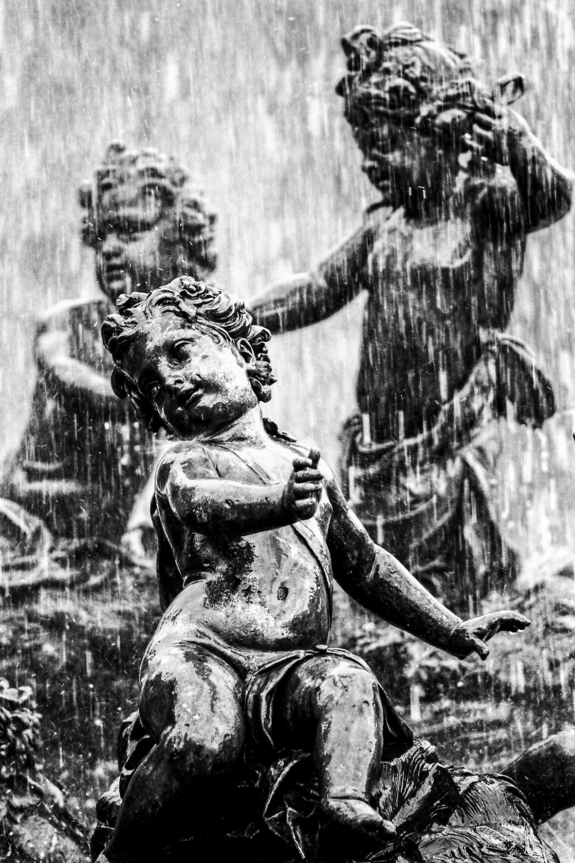 Des personnages figés dans le temps dont la posture parait définitive et l’expression immuable. L’eau qui jaillit puis s’écoule semble leur donner vie. La lumière qui filtre à chaque instant à travers les rideaux d’eau procure aux scènes une intensité parfois dramatique, parfois un sentiment de légèreté. Les tableaux s’animent, les statues se répondent. La représentation peut alors commencer.